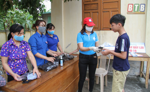Các đoàn thể xã An Cầu (Quỳnh Phụ) phát khẩu trang phòng, chống Covid-19 cho người dân.