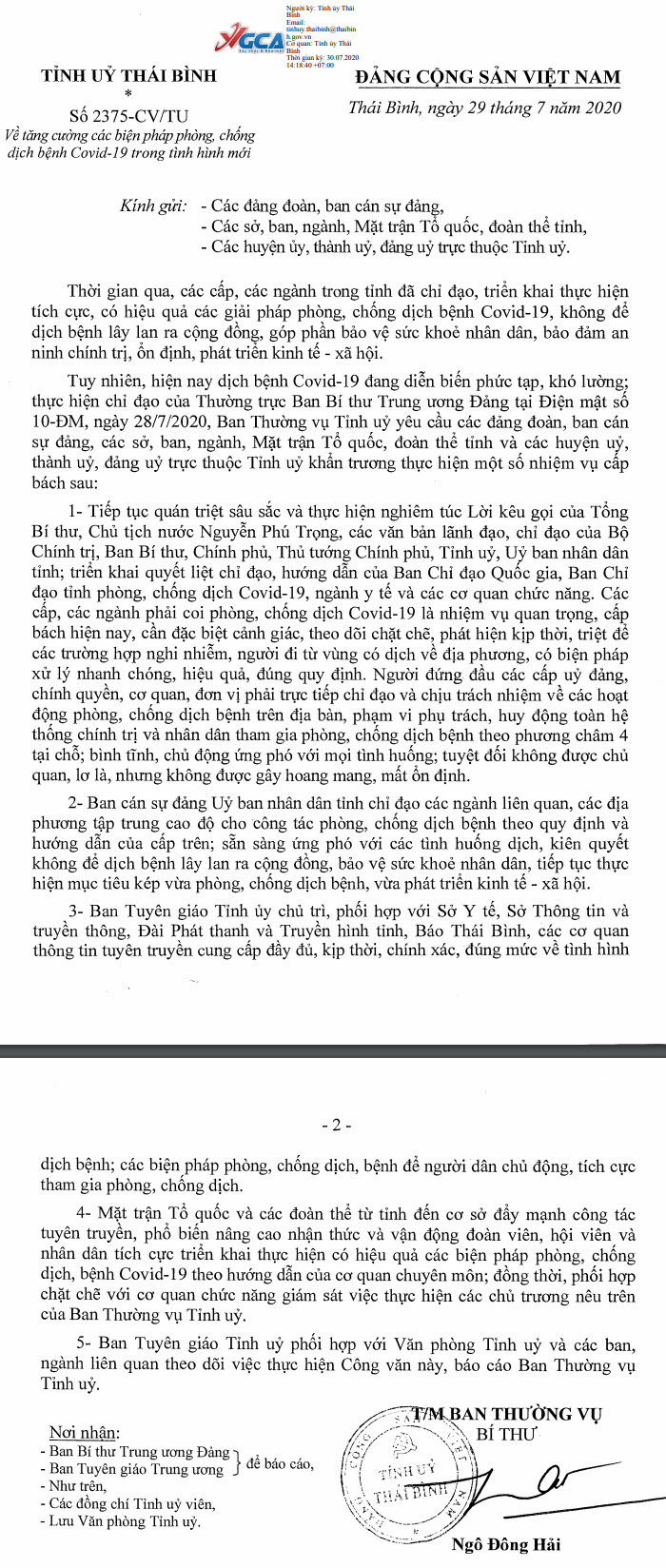 Ngày 29/7/2020, Tỉnh ủy Thái Bình ban hành Công văn số 2375-CV/TU về tăng cường các biện pháp phòng, chống dịch bệnh Covid-19 trong tình hình mới.
