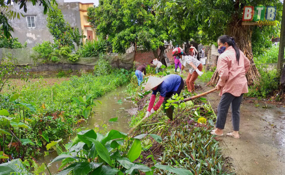 Nhân dân thôn Lương Ngọc, xã Tân Tiến làm vệ sinh môi trường.