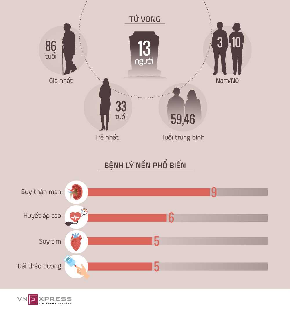 13 người, trong đó trẻ nhất 33 tuổi, già nhất 86 tuổi, ra đi trong 10 ngày qua, hầu hết có bệnh nền nặng như suy thận, tăng huyết áp, suy tim, đái tháo đường và Covid-19.