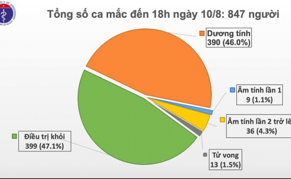 Như vậy, tính đến 18h ngày 10/8, Việt Nam có tổng cộng 847 ca mắc COVID-19, trong đó 318 ca nhiễm nhập cảnh được cách ly ngay; 13 bệnh nhân tử vong.