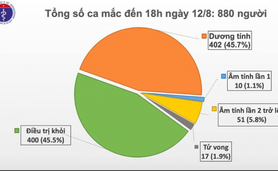 Như vậy, tính đến 18h ngày 12/8, Việt Nam có tổng cộng 880 ca mắc COVID-19, trong đó 321 ca nhiễm nhập cảnh được cách ly ngay; 17 bệnh nhân tử vong.