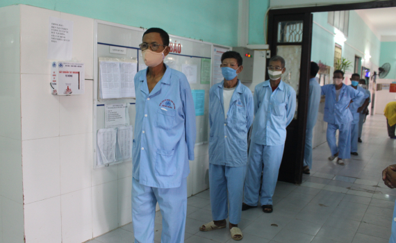 Bệnh nhân thực hiện giãn cách trước khi vào chạy thận nhân tạo tại Bệnh viện Đa khoa tỉnh.