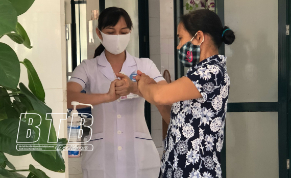 Người dân đến khám và điều trị tại Bệnh viện Đa khoa huyện Đông Hưng được hướng dẫn rửa tay đúng cách.