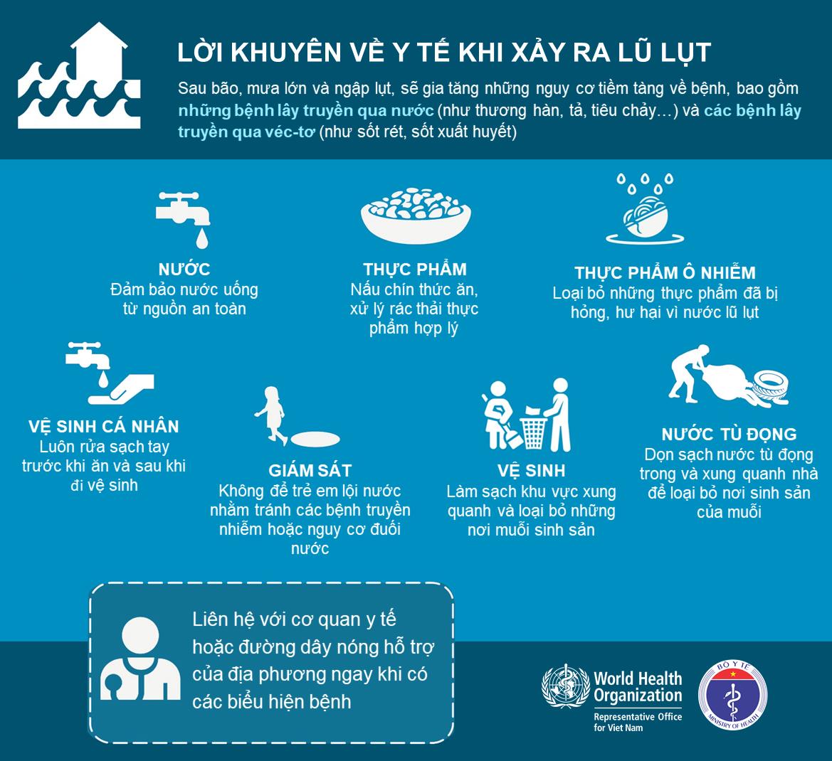Bộ Y tế và Tổ chức Y tế Thế giới tại Việt Nam đã xây dựng các Infographics hướng dẫn phòng chống dịch bệnh và giữ an toàn trong mùa lũ lụt, mưa bão.