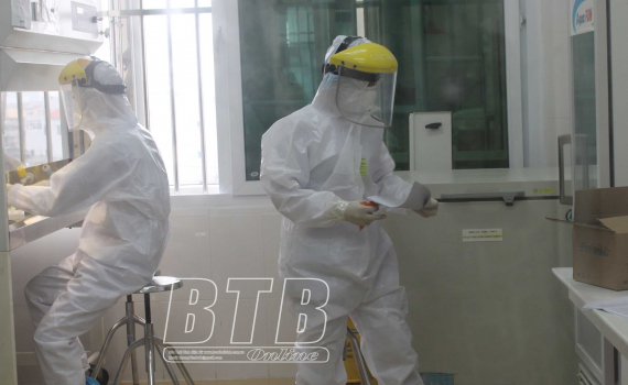 Cán bộ Trung tâm Kiểm soát bệnh tật tỉnh xử lý mẫu bệnh phẩm của người nghi nhiễm Covid-19.
