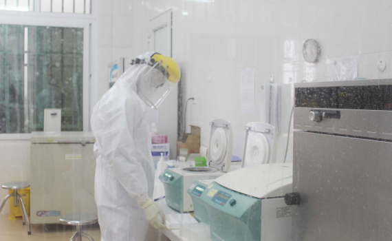 Cán bộ Trung tâm Kiểm soát bệnh tật tỉnh xử lý mẫu bệnh phẩm của người nghi nhiễm Covid-19.