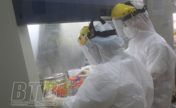 Cán bộ Trung tâm Kiểm soát bệnh tật tỉnh xử lý mẫu bệnh phẩm của người nghi nhiễm Covid-19.