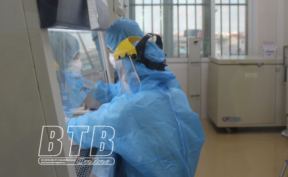 Cán bộ Trung tâm Kiểm soát bệnh tật tỉnh xử lý mẫu bệnh phẩm của người nghi nhiễm Covid-19.