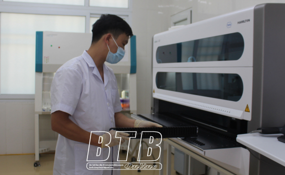 Cán bộ Trung tâm Kiểm soát bệnh tật tỉnh xét nghiệm mẫu bệnh phẩm của người nghi nhiễm Covid-19.