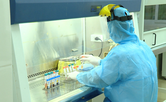 Cán bộ Trung tâm Kiểm soát bệnh tật tỉnh xét nghiệm mẫu bệnh phẩm của người từ nước ngoài về.