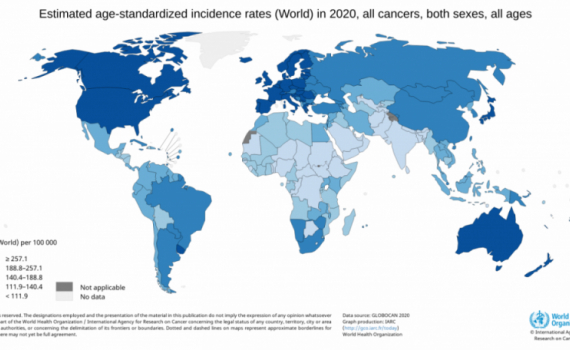Biểu đồ tỷ lệ ung thư (trên mỗi 100.000 dân) của các quốc gia trên thế giới.