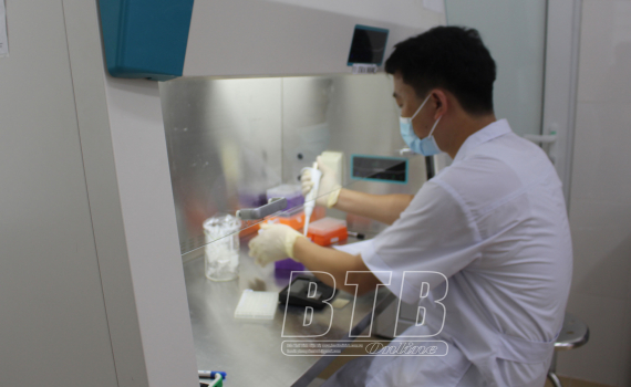 Cán bộ Trung tâm Kiểm soát bệnh tật tỉnh xét nghiệm mẫu bệnh phẩm của chuyên gia nước ngoài sang làm việc trên địa bàn tỉnh.