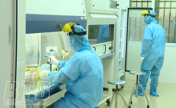 Cán bộ Trung tâm Kiểm soát bệnh tật tỉnh xét nghiệm mẫu bệnh phẩm của người nghi nhiễm Covid-19.