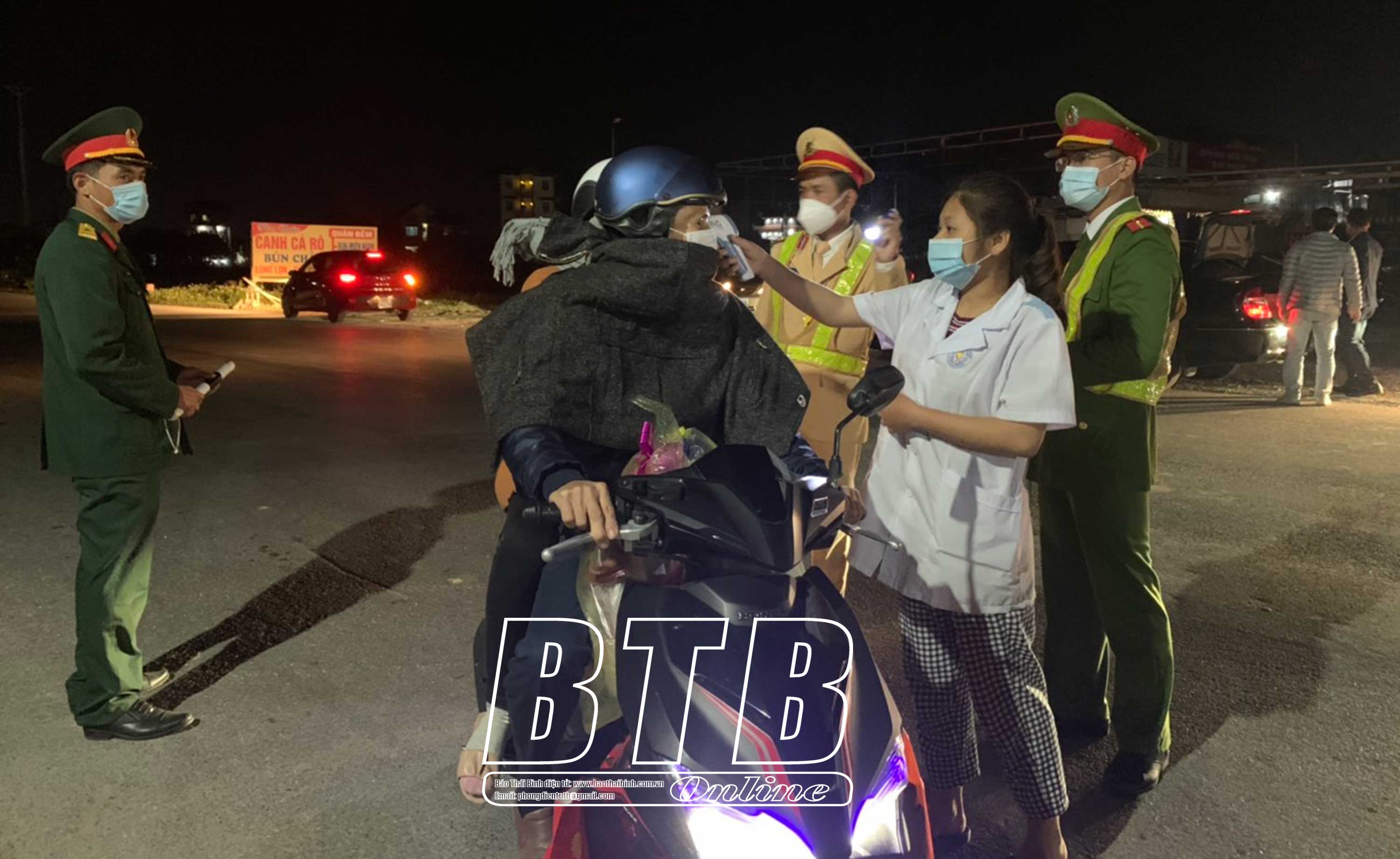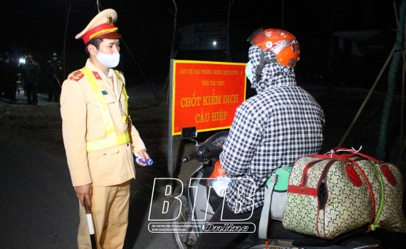 Lực lượng liên ngành thực hiện nhiệm vụ phòng, chống dịch Covid-19 tại chốt kiểm dịch cầu Hiệp (Quỳnh Phụ).