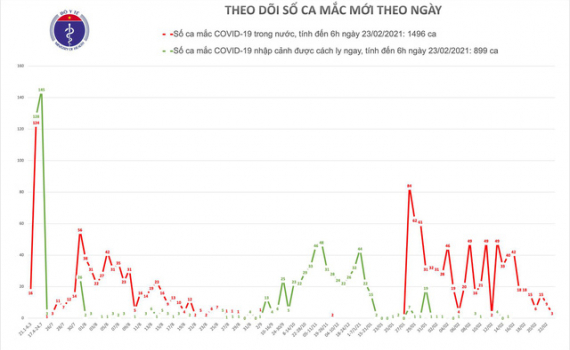 - Tính đến 6h ngày 23/02: Việt Nam có tổng cộng 1496 ca mắc COVID-19 do lây nhiễm trong nước, trong đó số lượng ca mắc mới tính từ ngày 27/1 đến nay: 803 ca.