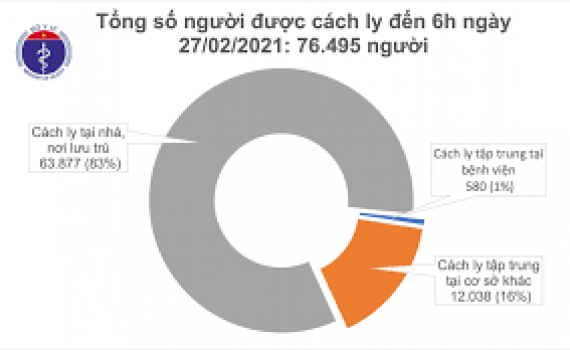 - Tính đến 6h ngày 27/2: Việt Nam có tổng cộng 1524 ca mắc COVID-19 do lây nhiễm trong nước, trong đó số lượng ca mắc mới tính từ ngày 27/1 đến nay là 831 ca.