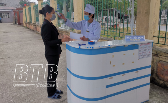 Người dân đến khám, chữa bệnh tại Bệnh viện Phổi Thái Bình được yêu cầu kiểm tra thân nhiệt.