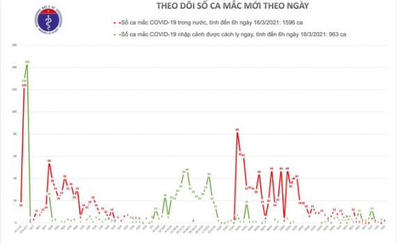 Tính đến 6h ngày 16/3: Việt Nam có tổng cộng 1596 ca mắc COVID-19 do lây nhiễm trong nước.