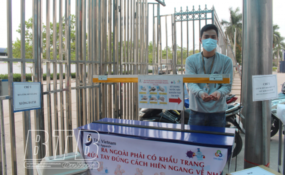Người đến làm việc tại doanh nghiệp được yêu cầu rửa tay sát khuẩn.