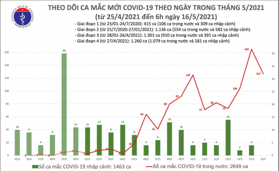 Như vậy đến 6h sáng ngày 16/5, Việt Nam đã ghi nhận tổng cộng 4.112 ca mắc Covid-19, trong đó có 2.649 ca lây nhiễm trong nước.