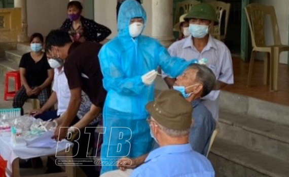 Cán bộ y tế thực hiện lấy mẫu xét nghiệm cho các trường hợp liên quan tại xã Điệp Nông (Hưng Hà).