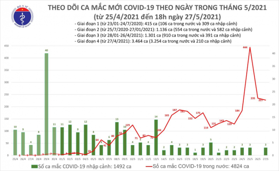 - Số lượng ca mắc mới tính từ ngày 27/4 đến nay: 3.254 ca.