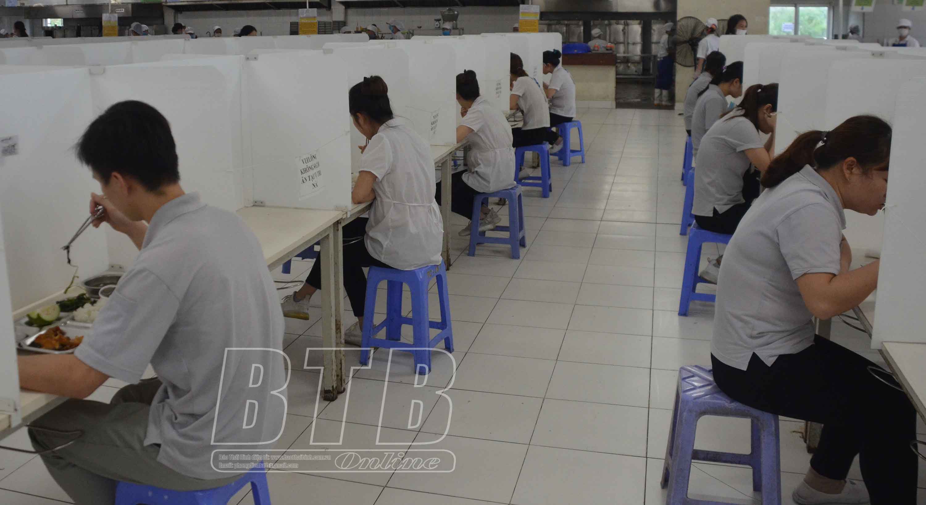 Công ty tổ chức chia bữa ăn ca làm nhiều bữa và ngồi giãn cách để phòng, chống dịch Covid-19.