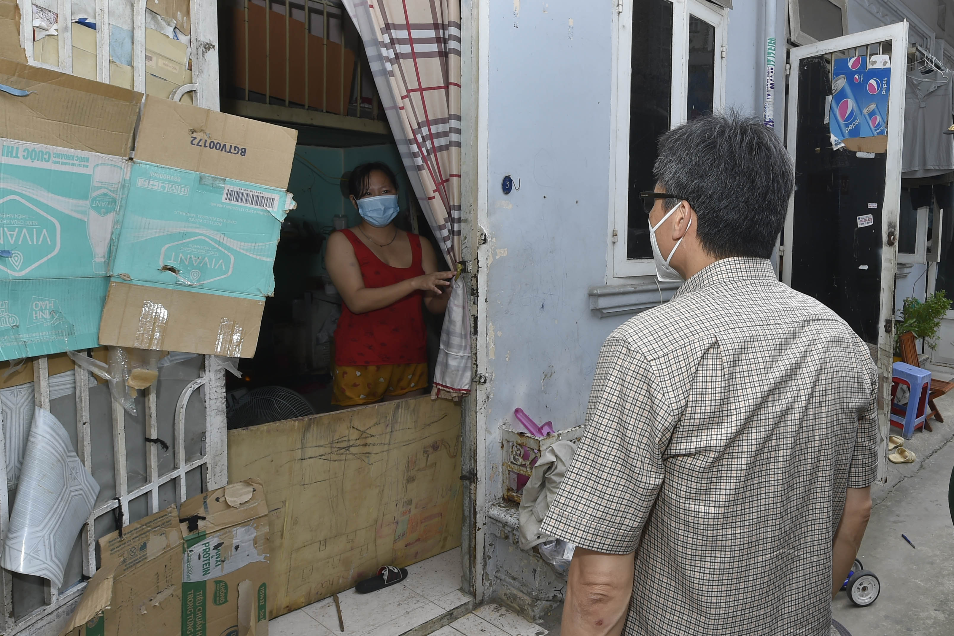 Phó Thủ tướng thăm hỏi một hộ dân ở trọ tại phường 14, quận Gò Vấp. - Ảnh: VGP/Đình Nam.
