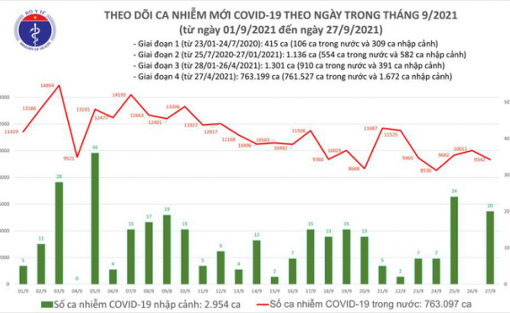 Tính từ 17h ngày 26/9 đến 17h ngày 27/9, trên Hệ thống Quốc gia quản lý ca bệnh Covid-19 ghi nhận 9.362 ca nhiễm mới, trong đó 20 ca nhập cảnh và 9.342 ca ghi nhận trong nước (giảm 669 ca so với ngày trước đó) tại 36 tỉnh, thành phố (có 4.453 ca trong cộng đồng).