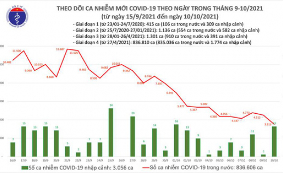 Tính từ 17h ngày 9/10 đến 17h ngày 10/10, trên Hệ thống Quốc gia quản lý ca bệnh Covid-19 ghi nhận 3.528 ca nhiễm mới, trong đó 15 ca nhập cảnh và 3.513 ca ghi nhận trong nước (giảm 999 ca so với ngày trước đó) tại 41 tỉnh, thành phố (có 1.211 ca trong cộng đồng).