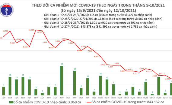 - Tính từ 17h ngày 11/10 đến 17h ngày 12/10, trên Hệ thống Quốc gia quản lý ca bệnh Covid-19 ghi nhận 2.949 ca nhiễm mới, trong đó 10 ca nhập cảnh và 2.939 ca ghi nhận trong nước (giảm 678 ca so với ngày trước đó) tại 43 tỉnh, thành phố (có 1.183 ca trong cộng đồng).