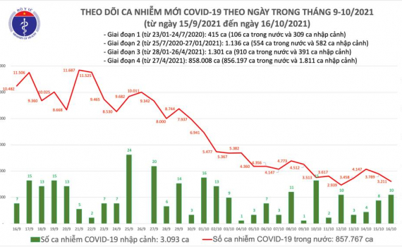 Tính từ 17h ngày 15/10 đến 17h ngày 16/10, trên Hệ thống Quốc gia quản lý ca bệnh COVID-19 ghi nhận 3.221 ca nhiễm mới, trong đó 10 ca nhập cảnh và 3.211 ca ghi nhận trong nước (giảm 578 ca so với ngày trước đó) tại 48 tỉnh, thành phố (có 1.172 ca trong cộng đồng).