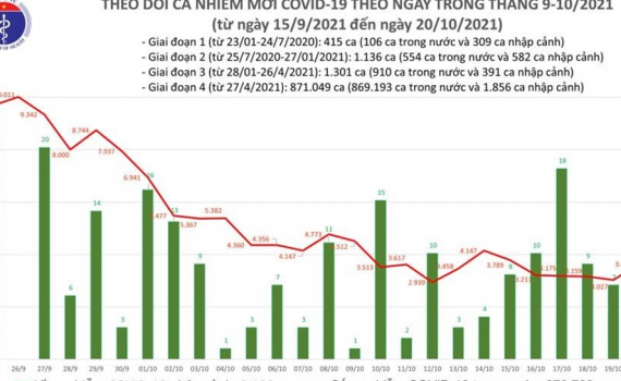 Tính từ 17h ngày 19/10 đến 17h ngày 20/10, trên Hệ thống Quốc gia quản lý ca bệnh COVID-19 ghi nhận 3.646 ca nhiễm mới, trong đó 11 ca nhập cảnh và 3.635 ca ghi nhận trong nước (tăng 608 ca so với ngày trước đó) tại 50 tỉnh, thành phố (có 1.810 ca trong cộng đồng).