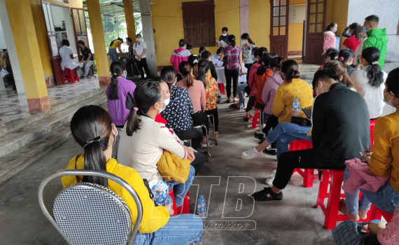 Công nhân lao động trên địa bàn huyện Quỳnh Phụ xếp hàng để test nhanh Covid-19.