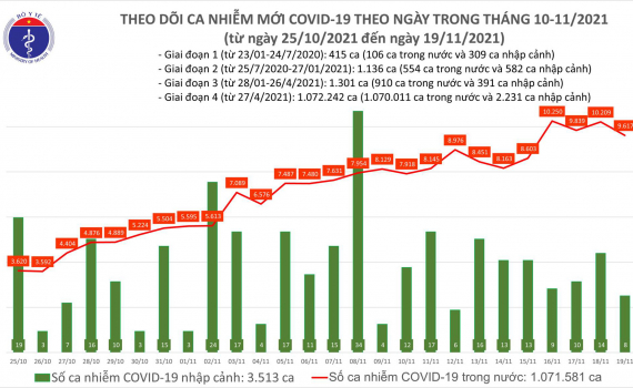 - Tính từ 16h ngày 18/11 đến 16h ngày 19/11, trên Hệ thống Quốc gia quản lý ca bệnh Covid-19 ghi nhận 9.625 ca nhiễm mới, trong đó 8 ca nhập cảnh và 9.617 ca ghi nhận trong nước (giảm 592 ca so với ngày trước đó) tại 57 tỉnh, thành phố (có 4.995 ca trong cộng đồng).