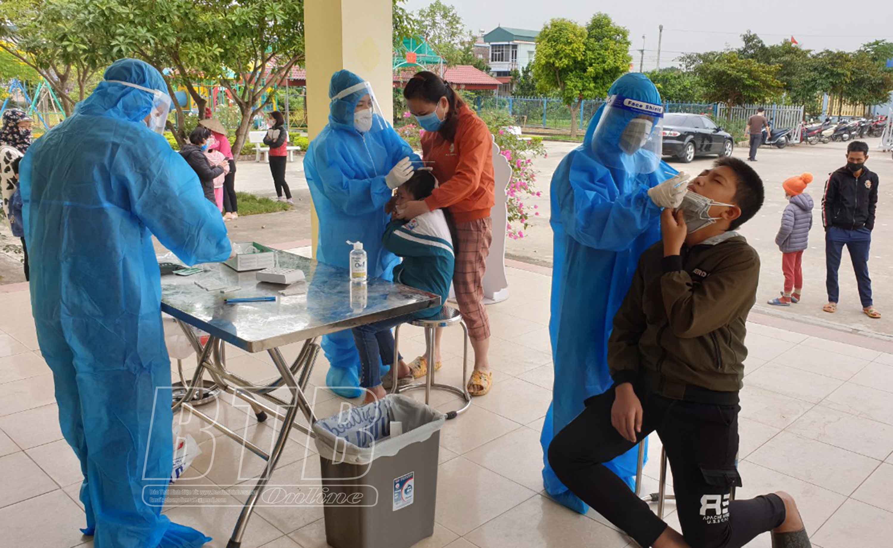 Lực lượng y tế thực hiện test nhanh Covid-19 cho người dân xã An Vinh (Quỳnh Phụ) để bóc tách F0 ra khỏi cộng đồng.