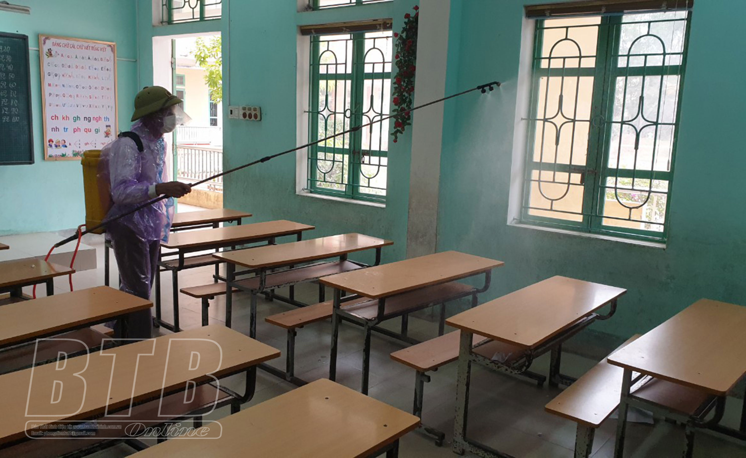 Trường Tiểu học thị trấn An Bài tổ chức phun khử khuẩn lớp học và toàn trường khi phát hiện giáo viên và học sinh nhiễm Covid-19.