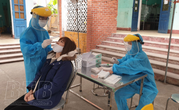 Người dân thị trấn An Bài test nhanh Covid-19 tại Trạm Y tế thị trấn.