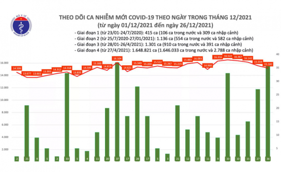 - Tính từ 16h ngày 25/12 đến 16h ngày 26/12, trên Hệ thống Quốc gia quản lý ca bệnh Covid-19 ghi nhận 15.218 ca nhiễm mới, trong đó 36 ca nhập cảnh và 15.182 ca ghi nhận trong nước (giảm 377 ca so với ngày trước đó) tại 62 tỉnh, thành phố (có 9.635 ca trong cộng đồng).