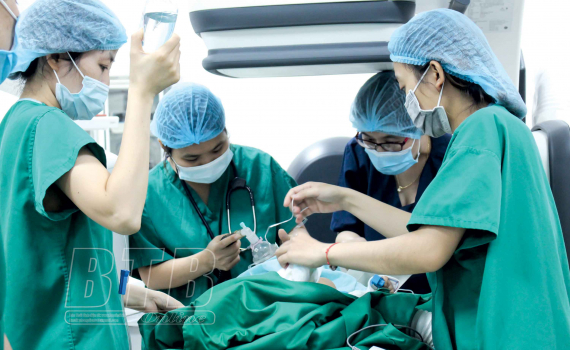 Các bác sĩ thực hiện kỹ thuật can thiệp tim mạch cho bệnh nhi.