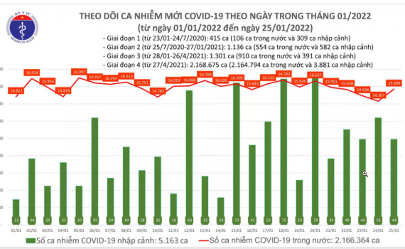 - Tính từ 16h ngày 24/01 đến 16h ngày 25/01, trên Hệ thống Quốc gia quản lý ca bệnh Covid-19 ghi nhận 15.743 ca nhiễm mới, trong đó 44 ca nhập cảnh và 15.699 ca ghi nhận trong nước (tăng 1.392 ca so với ngày trước đó) tại 61 tỉnh, thành phố (có 10.733 ca trong cộng đồng).