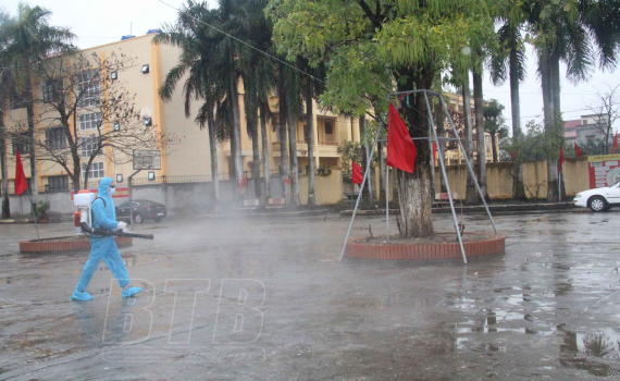 Các trường học huyện Hưng Hà tổ chức phun khử khuẩn tại các khuôn viên trường học để phòng, chống dịch Covid-19.