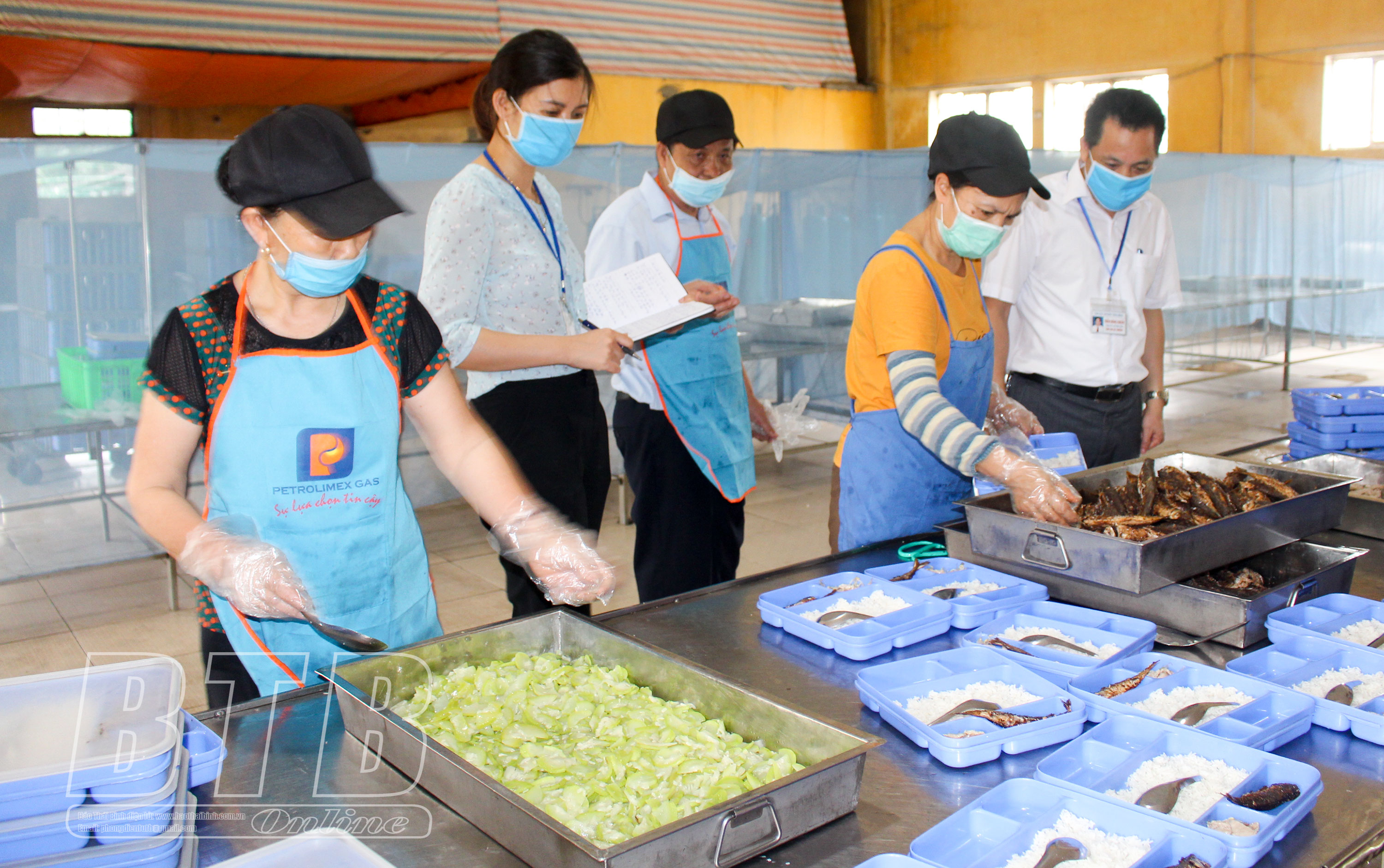 Đoàn kiểm tra của ngành y tế kiểm tra việc bảo đảm an toàn thực phẩm tại một cơ sở chế biến, kinh doanh cơm hộp.