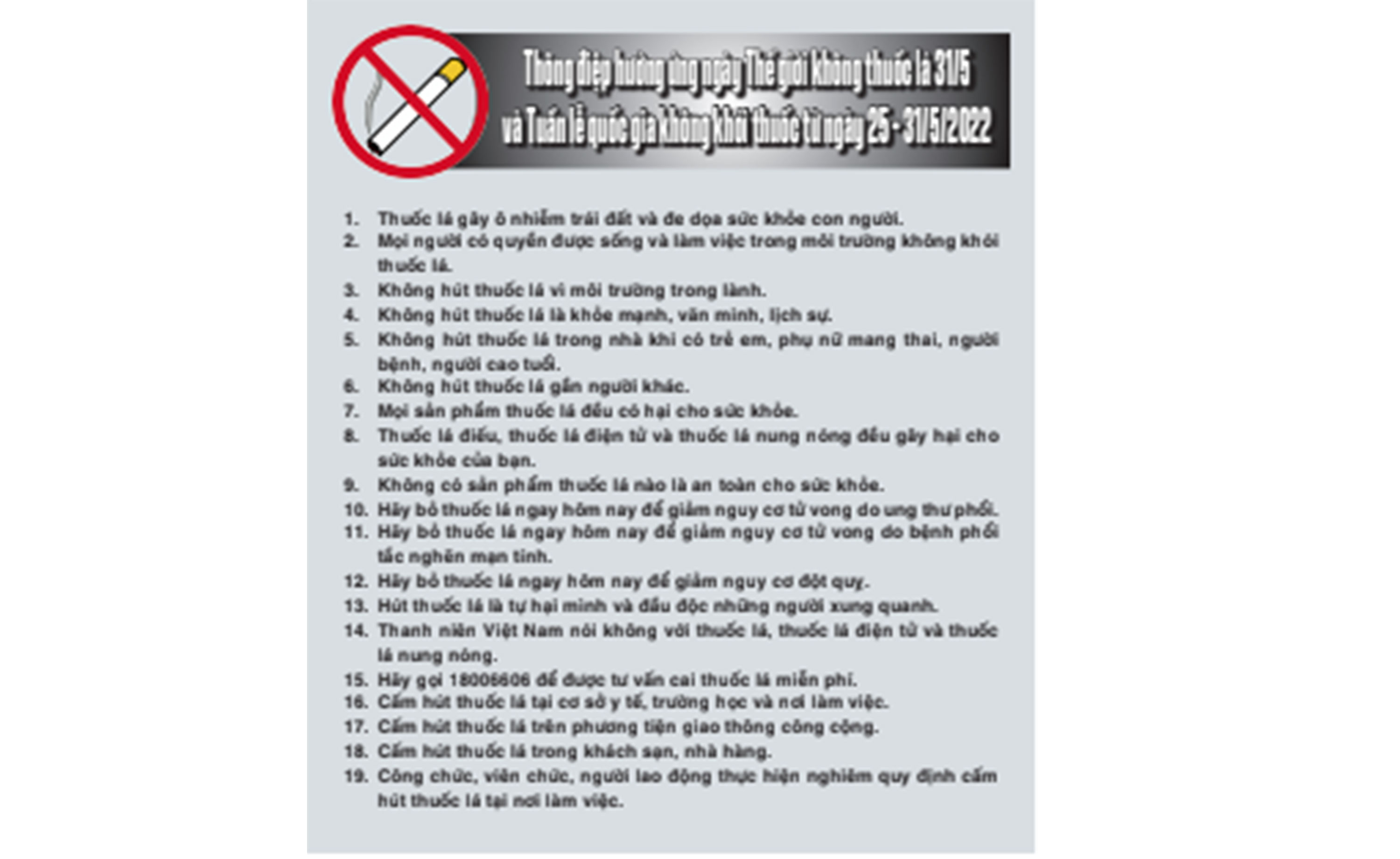 Để tăng cường thực hiện quy định về xây dựng môi trường không khói thuốc lá ngay từ cơ sở, năm 2022 Ban Chỉ đạo phòng, chống tác hại của thuốc lá tỉnh tiếp tục tăng cường công tác kiểm tra, giám sát, thanh tra tình hình thực hiện Luật Phòng, chống tác hại của thuốc lá và các văn bản hướng dẫn tại các cơ quan, đơn vị, bệnh viện, trường học, nhà hàng, khách sạn, bến xe... trên địa bàn tỉnh. Tiếp tục triển khai các hoạt động truyền thông bằng hình thức sân khấu hóa, đồng diễn thể thao không khói thuốc tại cộng đồng dân cư, trường học và tích cực thông tin, phản ánh về những tập thể, cá nhân làm tốt và chưa tốt trong công tác phòng, chống tác hại của thuốc lá.