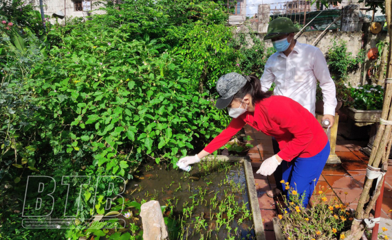 Cán bộ, nhân viên y tế điều tra, giám sát chỉ số côn trùng tại khu vực có ca mắc sốt xuất huyết xã Đông Các (Đông Hưng).