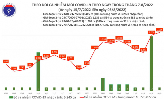 Về tình hình điều trị, theo số liệu do Sở Y tế các tỉnh, thành phố báo cáo hàng ngày trên Hệ thống quản lý COVID-19 của Cục Quản lý Khám chữa bệnh, Bộ Y tế, ngày 3/8, có 7.750 bệnh nhân được công bố khỏi bệnh, nâng tổng số ca bệnh được điều trị khỏi lên 9.940.462 ca.