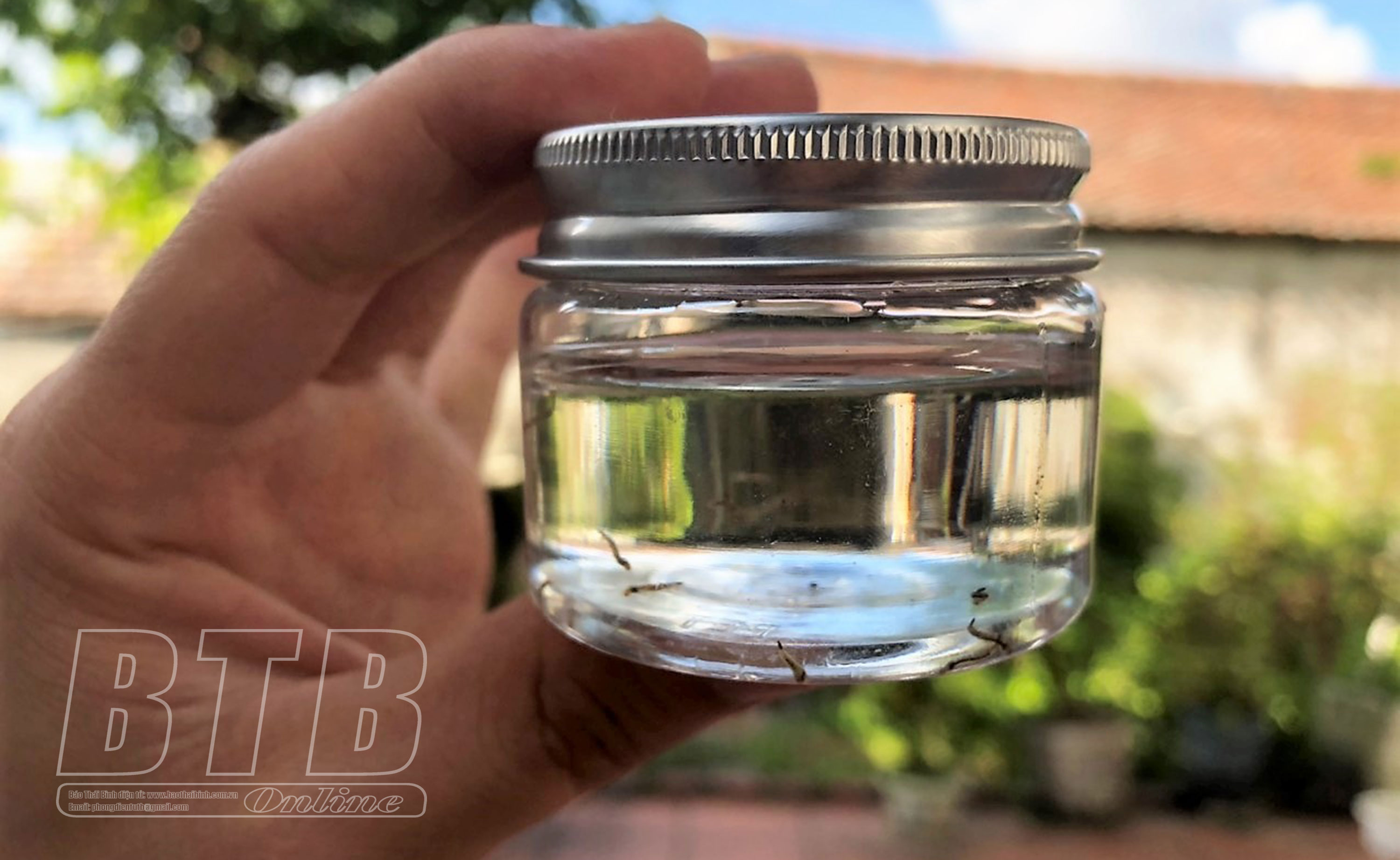 Cán bộ y tế phát hiện muỗi, bọ gậy truyền bệnh SXH tại khu vực các hộ xung quanh nhà bệnh nhân.