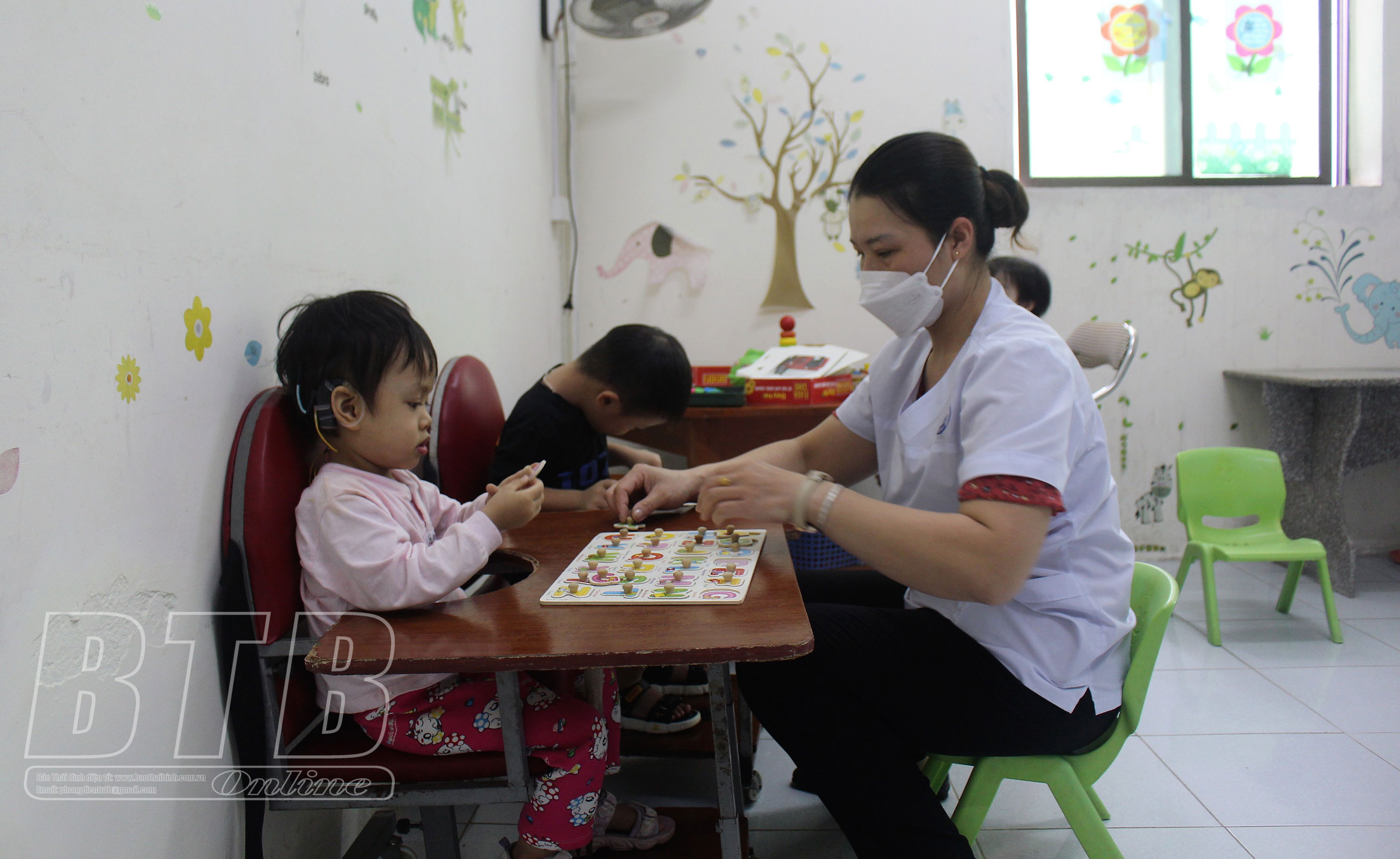 Nhân viên y tế hướng dẫn trẻ làm quen với trò chơi tại Bệnh viện Phục hồi chức năng Thái Bình.