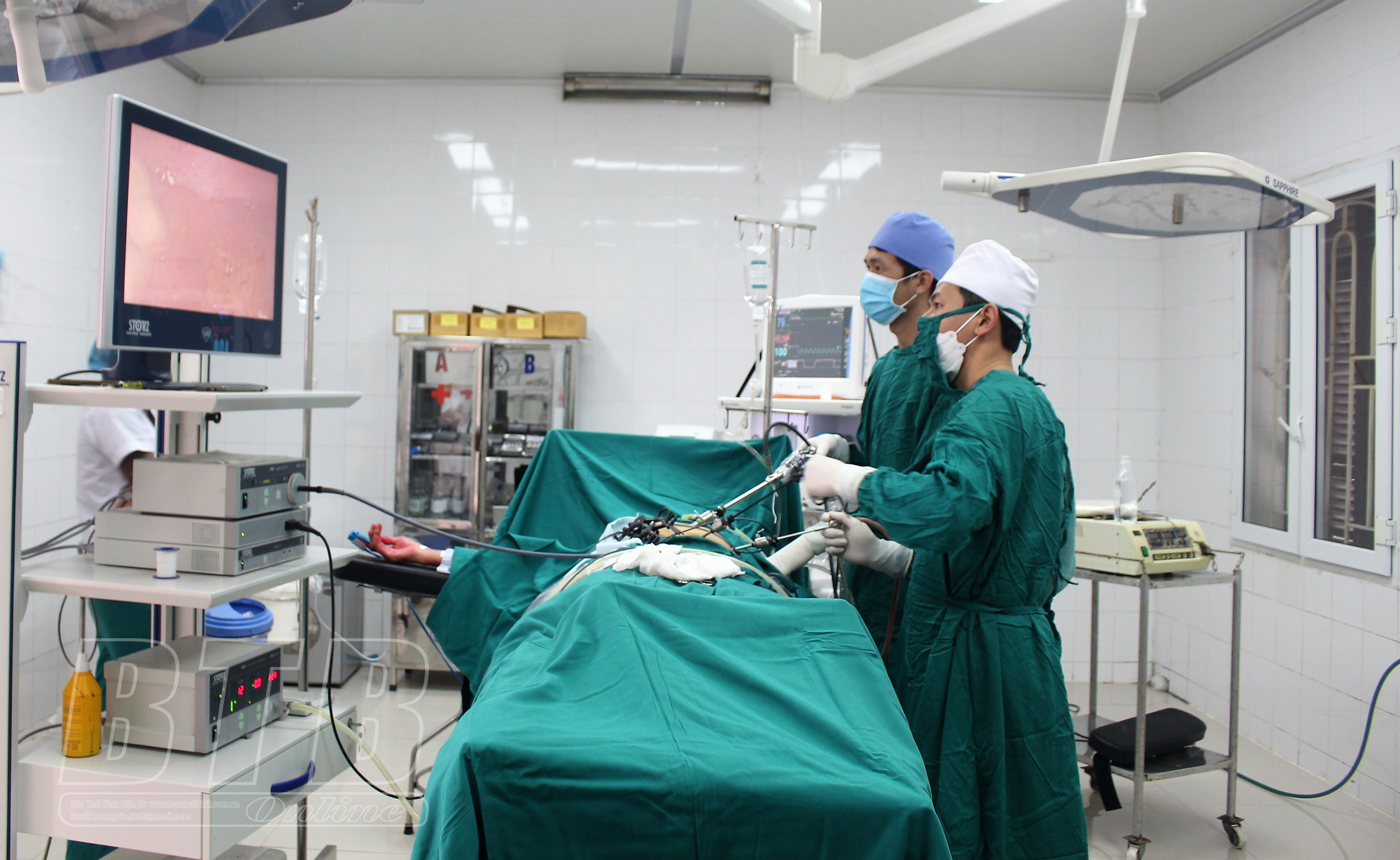 Các bác sĩ Bệnh viện Đa khoa huyện Kiến Xương phẫu thuật nội soi cho người bệnh.